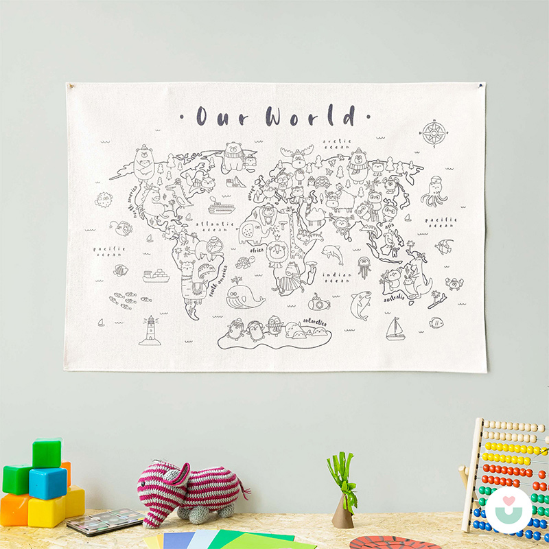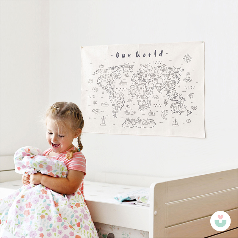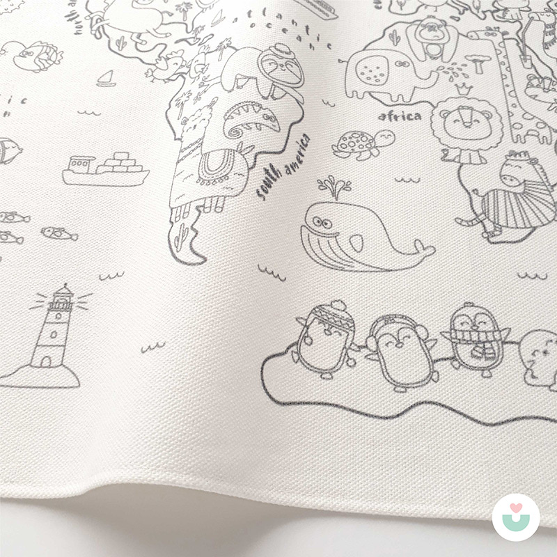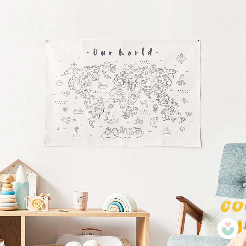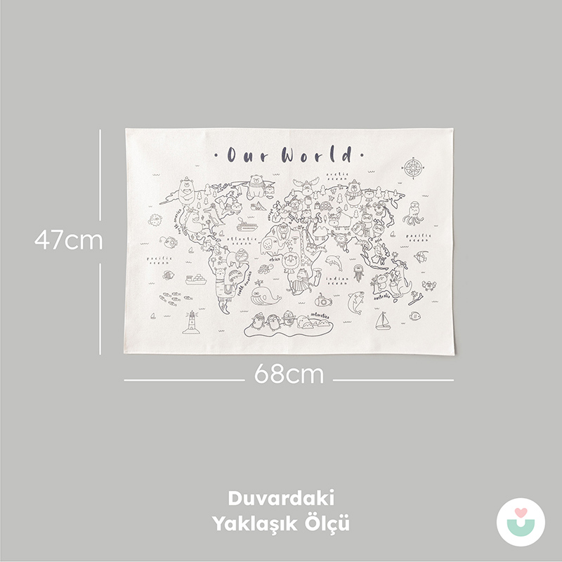 Gelince Haber Ver🖤Minimalist siyah-beyaz tasarımıyla dikkat çeken bu dünya haritası duvar örtüsü, çocukların dikkatini dağıtmadan hayvanları öğrenmelerine yardımcı olur. Organik pamuktan üretilmiş Jüppo tasarımı, sade dekorasyon tercih eden ebeveynler için harika bir seçim. Eğlenceli, doğal ve zarif bir atmosfer sunar.