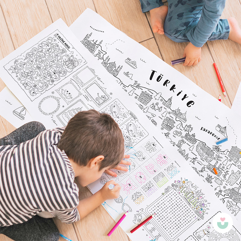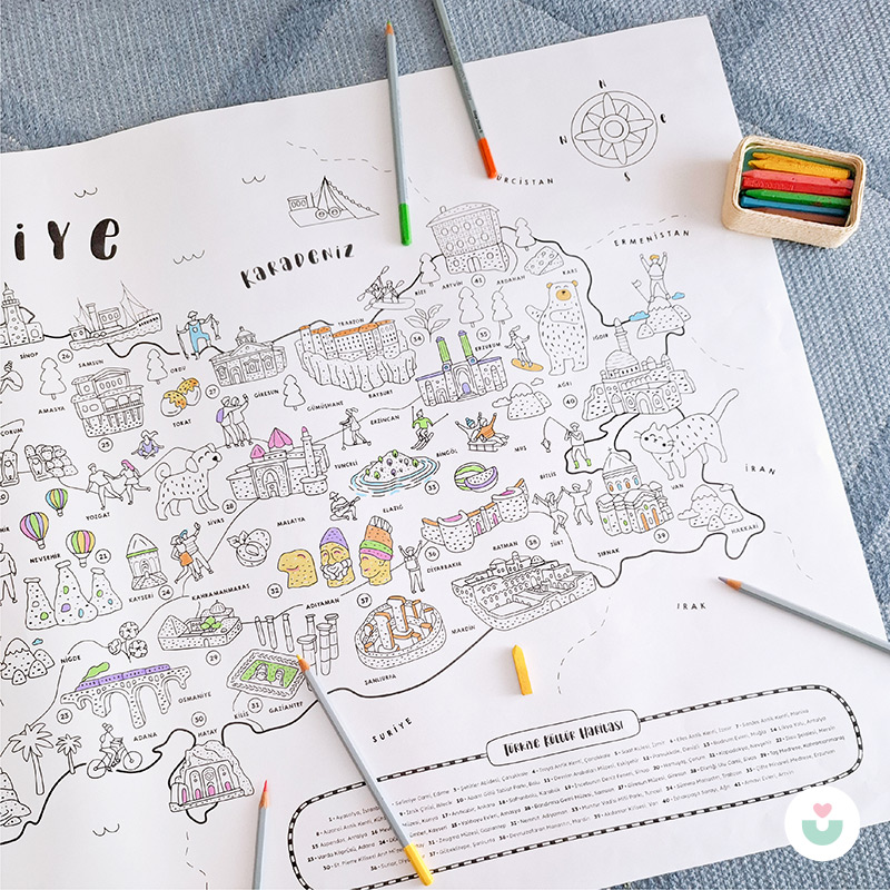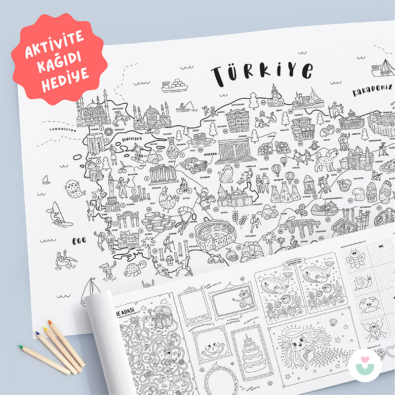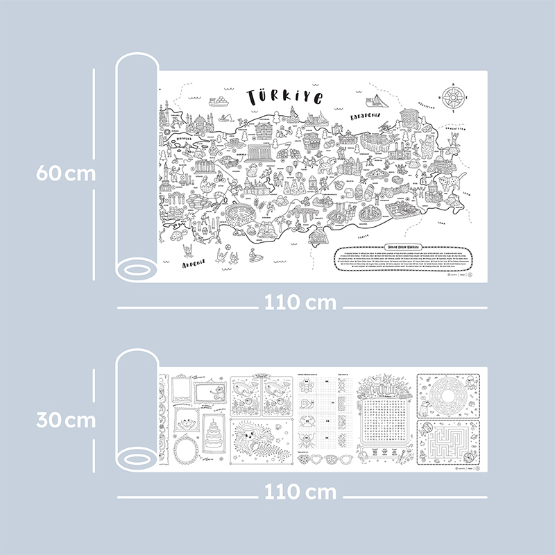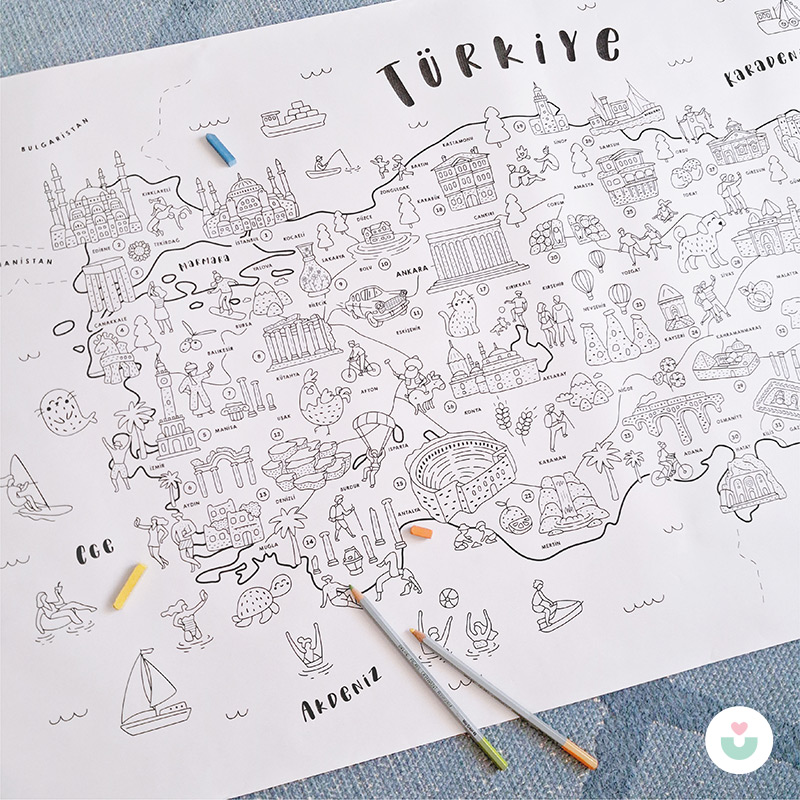 Özel tasarlanan bu haritada Türkiye’nin dört bir yanından kültürel varlıklar, tarihi yapılar, doğal güzellikler eğlenceli illüstrasyonlarla bir araya geliyor. Pamukkale travertenlerinden Kapadokya balonlarına, Sümela Manastırı'ndan Göbeklitepe’ye kadar pek çok önemli noktayı içeren bu dopdolu harita, çocuklara boyarken öğrenme fırsatı sunuyor.