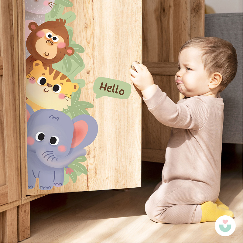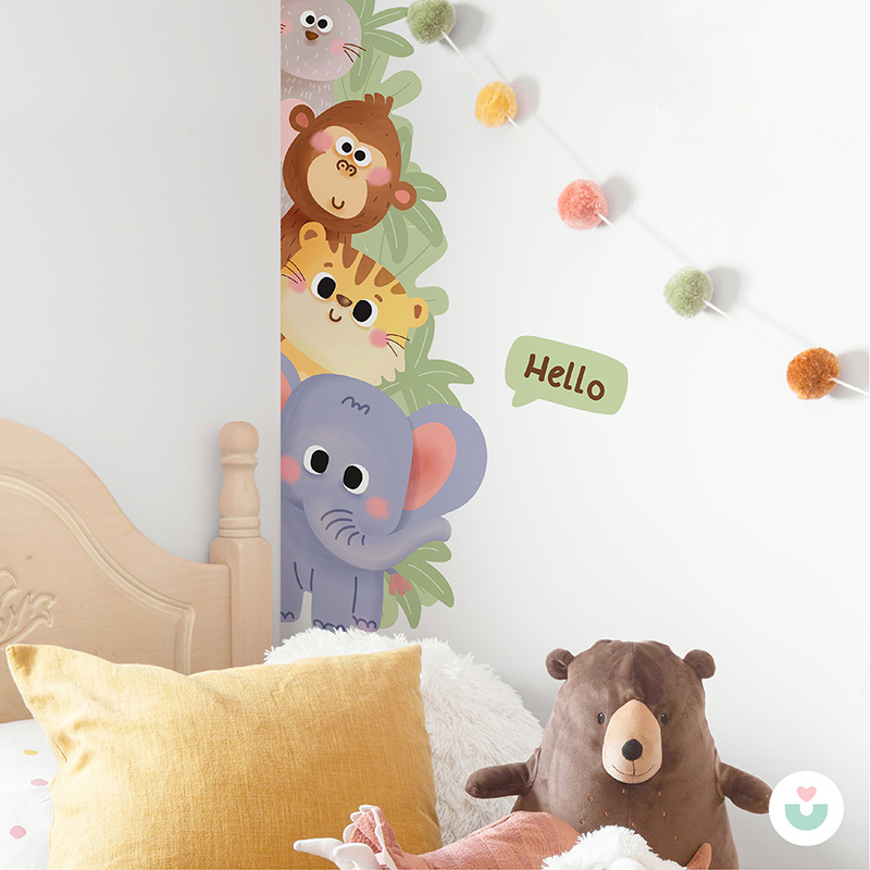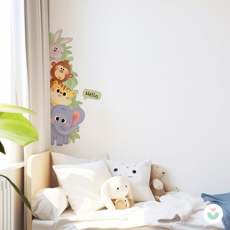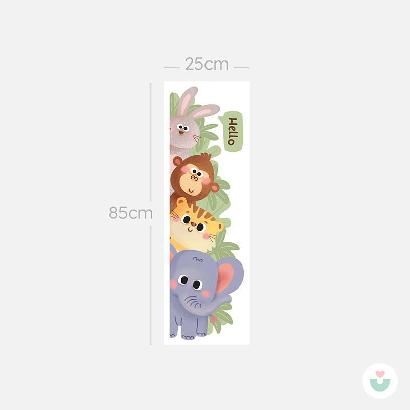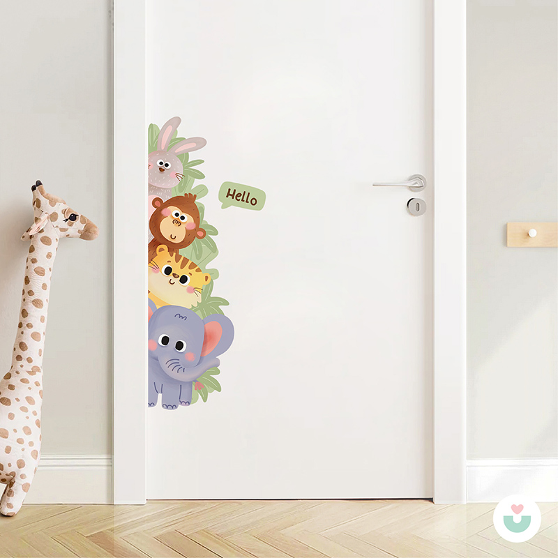 Gelince Haber Ver🐘 Jüppo’nun sevimli hayvanları bu eğlenceli kapı kenarı duvar sticker’ında buluşuyor! Fil, kaplan, maymun ve tavşan üst üste dizilmiş, çalıların arasından merakla bakıyor. “Hello” yazısıyla ziyaretçileri karşılayan bu neşeli tasarım, bebek ve çocuk odalarına hayat ve enerji katıyor.